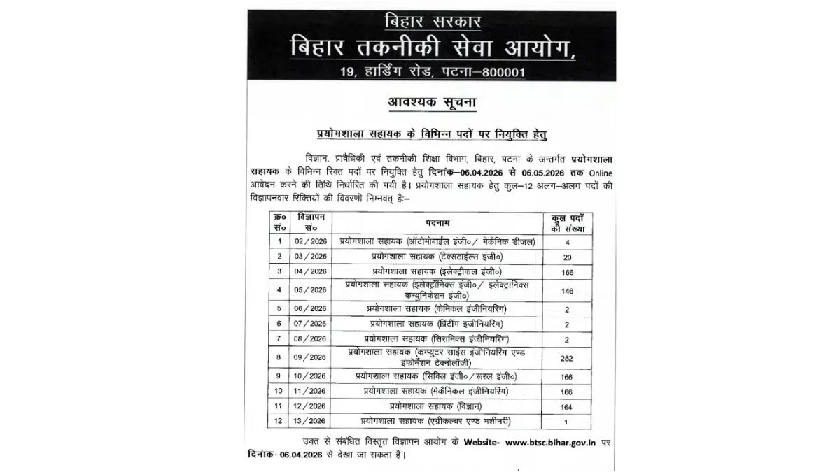 Bihar Technical Service Commission (BTSC), Patna has released the notification of BTSC Laboratory Assistant Recruitment 2026 (Advertisement No. 02/2026 to 13/2026) for various posts of Laboratory Assistant under the Department of Science, Technology and Technical Education, Bihar. Eligible candidates can now apply online for BTSC Laboratory Assistant Recruitment 2026 for recruitment to a total of 1091 posts. This recruitment is in various engineering and science disciplines (Automobile/Mechanical Diesel, Textile, Electrical, Electronics, Chemical, Printing, Ceramics, Computer Science, Civil, Mechanical, Science, Agriculture etc.). BTSC Online Application Form 2026 will be available on the official website of the Commission from 06.04.2026 to 06.05.2026. This article provides complete information about the BTSC Laboratory Assistant Vacancy 2026, including educational qualifications, age limits, application fees, pay scales, selection procedures, and how to apply online. Interested candidates should carefully read the official BTSC Notification 2026. BTSC Laboratory Assistant Jobs 2026, eligibility criteria, important dates, and application links are provided below.