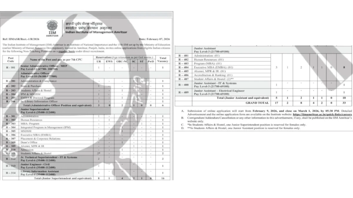 Indian Institute of Management Amritsar has officially released the IIM Amritsar Recruitment 2026 notification for 33 Posts including Administrative Officer, Junior Superintendent, and Junior Assistant at iimamritsar.ac.in. Candidates seeking government jobs can now apply for IIM Amritsar Recruitment 2026 through the online application process. The IIM Amritsar Online Application Form 2026 is available from 09.02.2026 to 01.03.2026 on the official website. This article covers complete details about IIM Amritsar Vacancy 2026 including educational qualification, age limit, application fee, salary structure, selection process, exam pattern, and how to apply online. Interested candidates must carefully read the official IIM Amritsar Notification 2026 before starting the registration process. Find all important information about IIM Amritsar Jobs 2026, eligibility criteria, important dates, and direct application link below.