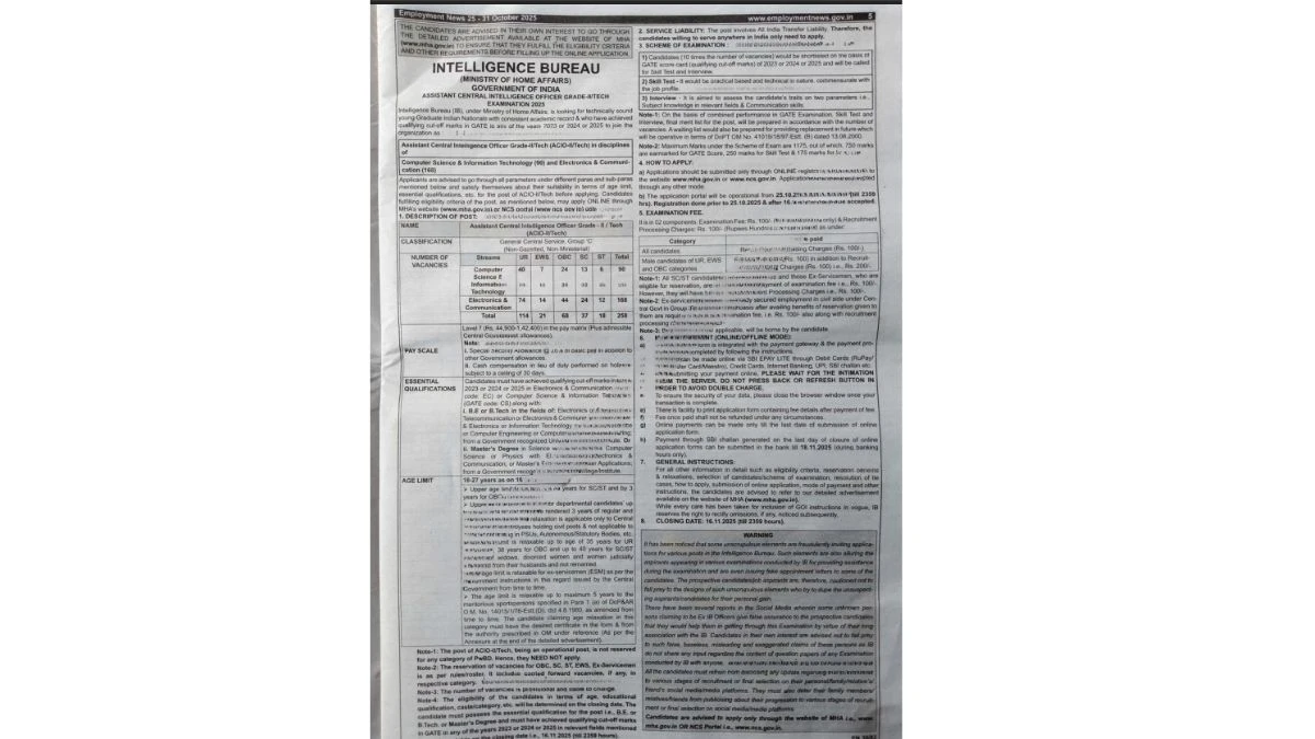 - Intelligence Bureau ACIO II Tech Recruitment 2025 – 258 Posts, Online Form Out at mha.gov.in