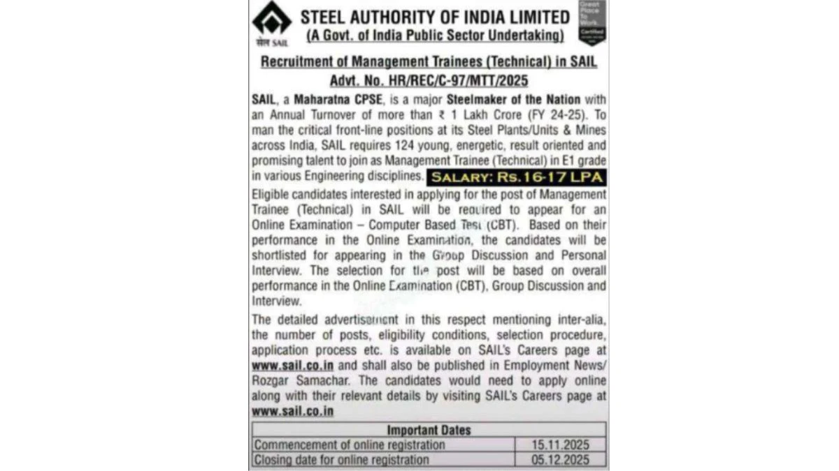 SAIL Recruitment 2025: The Steel Authority of India (SAIL) has announced a new recruitment short notification for 124 Management Trainee vacancies. Candidates who are interested and meet the eligibility criteria can apply online through the official SAIL website before the last date, 05-12-2025.